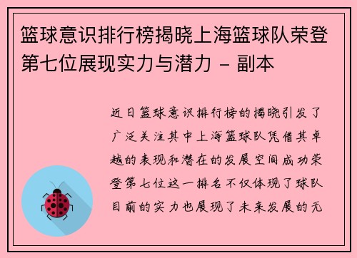 篮球意识排行榜揭晓上海篮球队荣登第七位展现实力与潜力 - 副本
